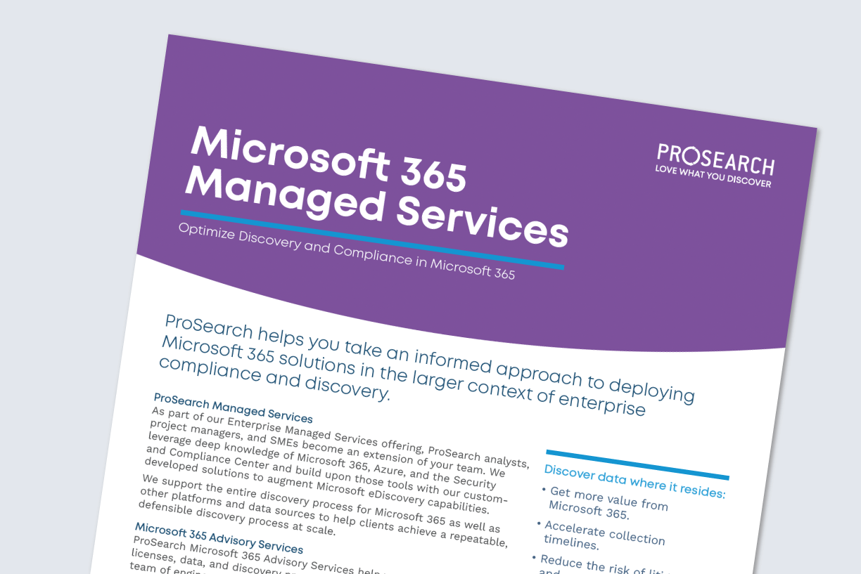 ProSearch helps our Enterprise clients reduce risk and better manage legal discovery of growing volumes of data with our Microsoft 365 Managed Services.