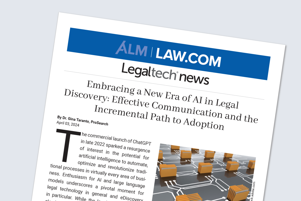 Embracing a New Era of AI in Legal DiscoveryDr. Gina Taranto2025-08-28T18:05:11+00:00April 5, 2024|Articles|Read More