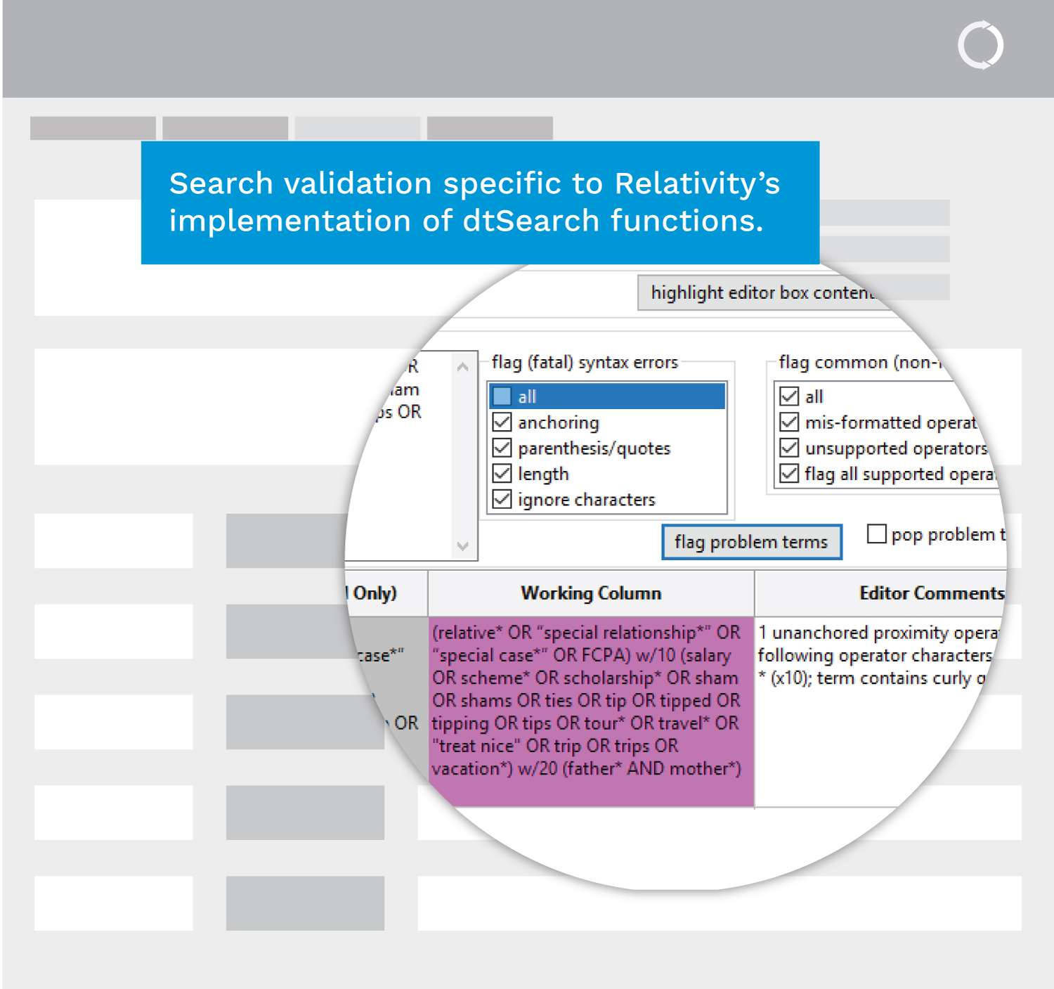 Just because a search completes, does not mean it is correct. Our teams check terms for logic, syntax, and technical errors that might compromise results. We provide proposed changes and corrections along with detailed reports explaining the rules and errors. Our Search Term Inspector is designed specifically for Relativity, checking Relativity-specific implementation of dtSearch functions.