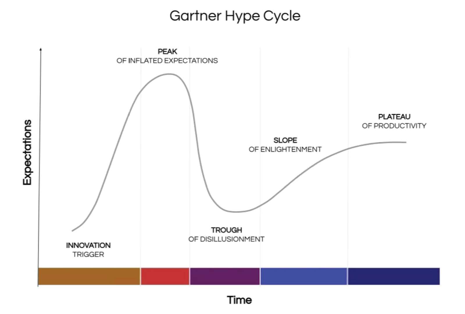 The technology adoption cycle is a well-known process. Gartner calls it the Hype cycle. It’s divided up into distinct phases that most disruptive technologies must travel through as a rite of passage. It starts with some sort of innovation trigger: a new vendor, a news report, an unveiling. Think of Steve Jobs holding up the original iPhone. It is exciting, new, promising the world. It’s the whole internet in your hand! Our excitement grows and reaches the Peak of Inflated Expectations.
