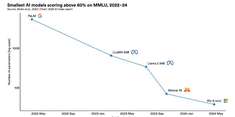 Above all though, the LLMs are getting smarter and smaller. The ‘mini’ LLMs, that is those LLMs that are trained on mere billions parameters, are achieving the same results as those full scale LLMs from a few years ago, such as GPT3.5[6]. The training is therefore becoming more efficient. As a result smaller models tend to be trained more quickly, consume less power and above all are cheaper than their full-scale alternatives.